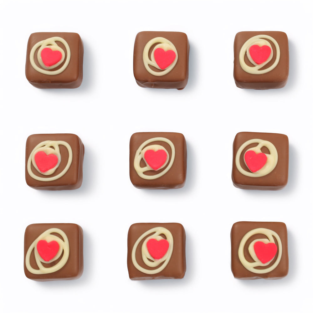 Smooth caramel wrapped in creamy chocolate, topped with colourful sweetheart candy for a festive crunch.