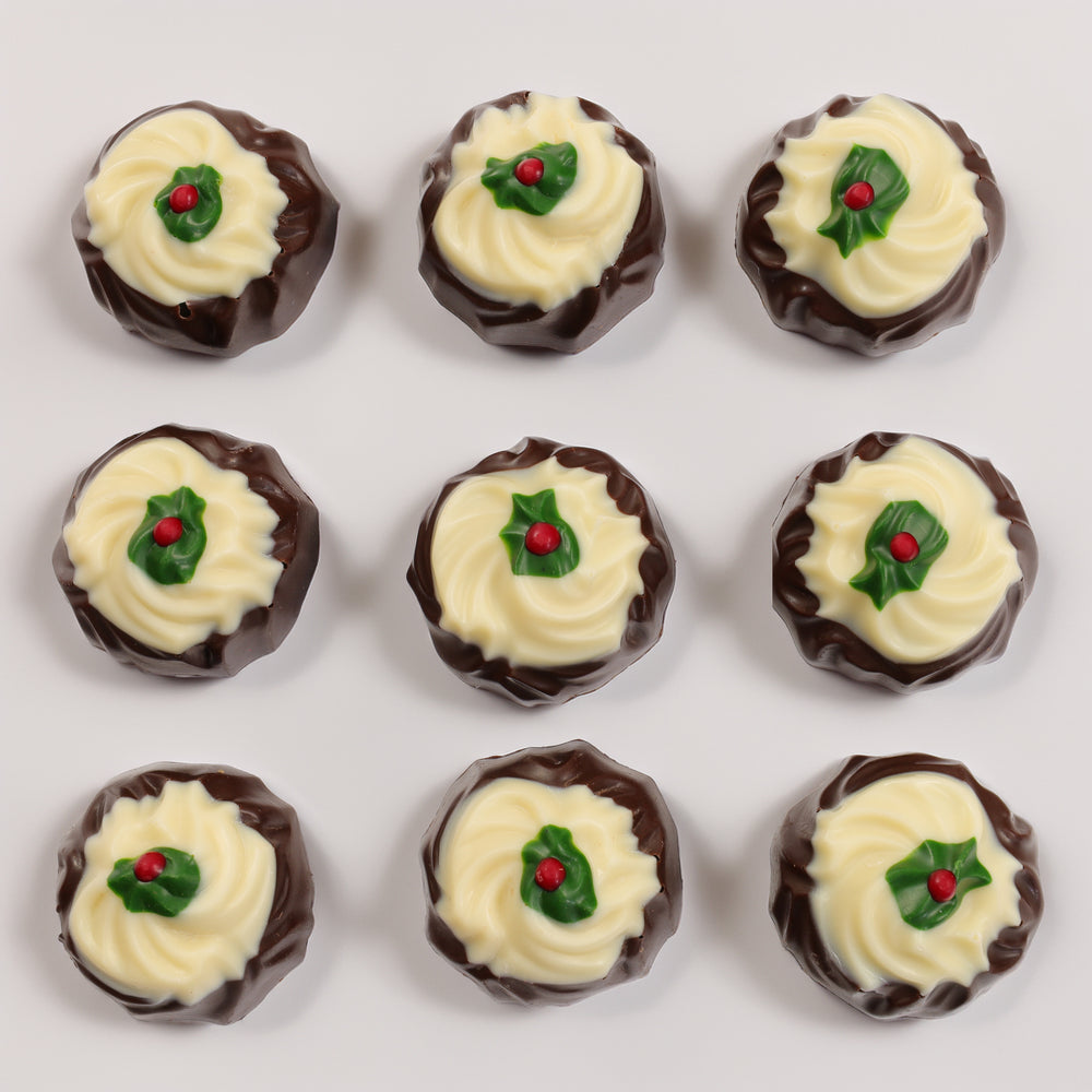 A delicious dark chocolate with Baileys cream and decorated with white, green and red to resemble a traditional Christmas Pudding. Handmade in New Zealand by Van Heiningen chocolatier.