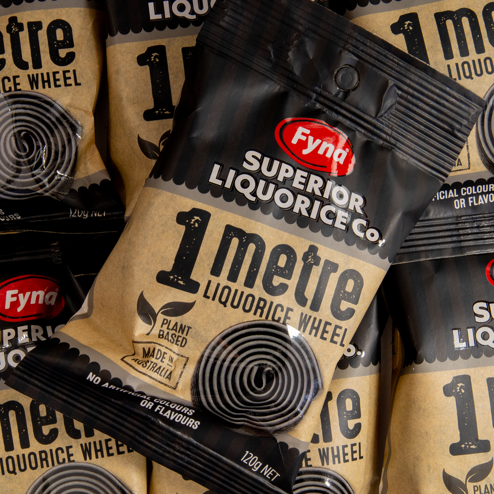 Unwind the 1 metre long licorice wheel in raspberry or classic licorice.
