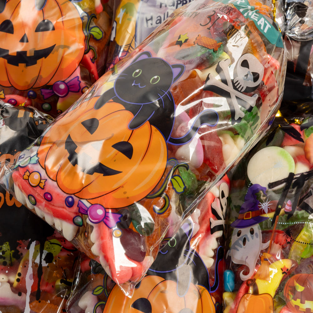 A fun assortment of Halloween-themed treats including witches, devils, Dracula milk bottles, pumpkins, and vampire bats. Enjoy the sweet flavours of the spooky season all in one bag.